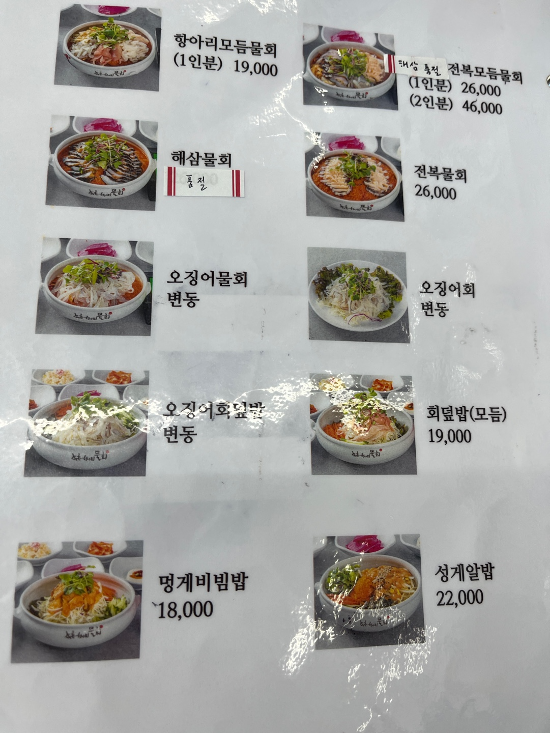 1. 항아리 물회: 이 식당의 대표 물회죠. 다들 이것 드시려고 서울에서 외국에서 오시는 거잖아요. 광어, 우럭, 전복, 해삼 등 다양하고싱싱한 해산물에 고추장 베이스의 새콤달콤한 육수와 오이, 배 등아삭아삭한 야채들이 어우러져 입맛을 확 돌게합니다.