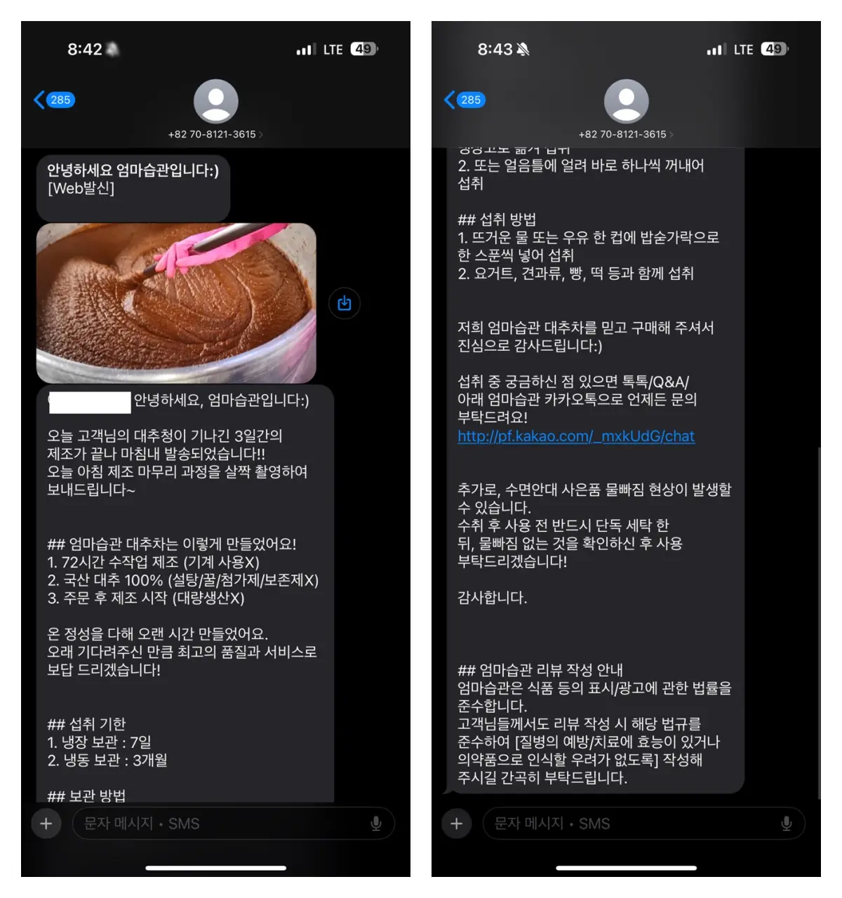 내 대추차가 수작업으로 만들어졌다는 문자와 함께 섭취기한, 보관 방법, 섭취 방법까지 친절하게 나와있어요. 정말 케어받는 기분이 들더라고요. 왠지 기분 좋은 시작으로 대추차 먹고 좋은 일이 생길 것만 같은 느낌인 거죠.